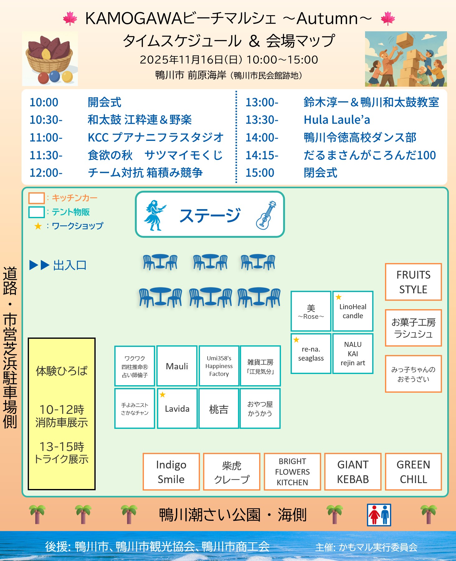 2025年11月16日(日)に鴨川市前原海岸で開催される「KAMOGAWAビーチマルシェ ~Autumn~」の会場マップを公開しました!