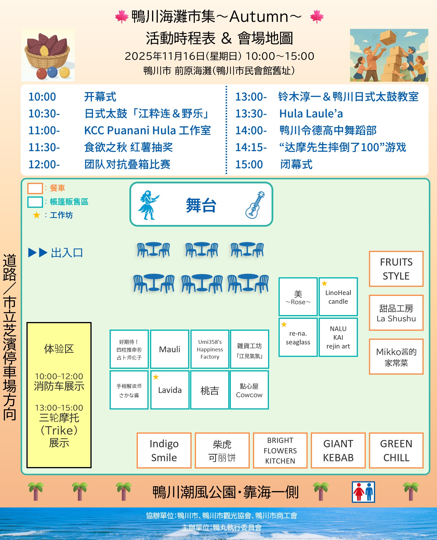 我們已經公開了將於 2025 年 11 月 16 日(星期日)在鴨川市前原海岸舉辦的「KAMOGAWA 海灘市集 ~Autumn~」 的會場地圖!